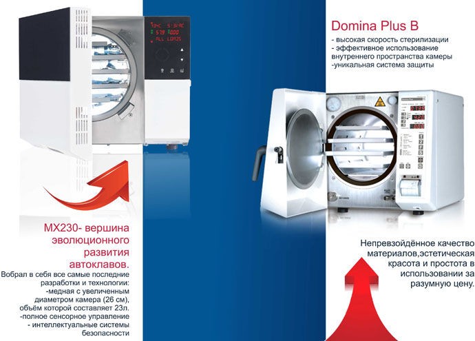 Отдельного внимания заслуживают стерилизационные аппараты итальянской компании Dental X. В частности, флагманская модель итальянской фирмы МХ 230 имеет просто космический дизайн, навевая воспоминания о других планетах и полетах на космических кораблях. Удивительно лаконичный и в то же время несравненно стильный дизайн и фантастические возможности – это именно те слова, которые характеризуют данную модель автоклава класса B. Она способна воспроизводить до четырех циклов предвакуума, проводя при этом стерилизацию всего за какие-то 20 минут. Модель объемом 23 литра имеет девять программ стерилизации при возможности ручной установки температуры от 105°С до 135°С. Есть опция подключения USB-разъема, а также подключения к принтеру и компьютеру. Другие модели имеют более скромные характеристики, тем не менее, не уступая самым лучшим мировым аналогам. Кроме самого продвинутого класса автоклавов, в ассортименте итальянского производителя имеются машины линеек – S и N. Объем камеры варьируется от 4,5 до 22 литров. Все модели имеют простое и интуитивно понятное управление и не менее четырех программ стерилизации. Базовый аппарат ATOMA PLUS S имеет встроенный принтер, бактериальный фильтр и микропроцессор контроля термодинамического выброса воздуха и сушки. Он может выполнять ряд несложных задач и может стать вашим незаменимым помощником.